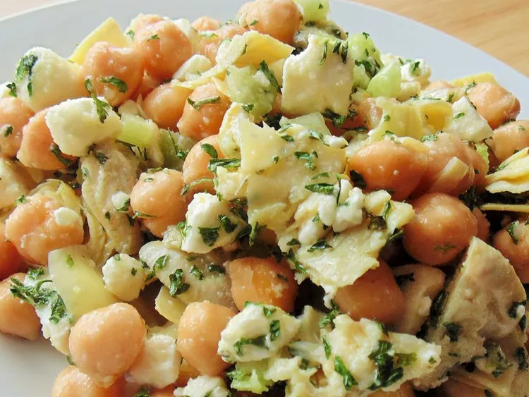 A fresh chickpea and artichoke salad from ingredients that last a long time in the pantry and refrigerator. It has a ...